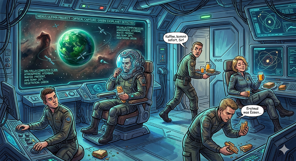 Commander Wunjo ging zu Sergant Hagalaz, schnappte sich ein Sandwich und sagte: "Leute, den grünen Exoplaneten schauen wir uns an", biss in das Sandwich und ging kauend zu Leutnant Perthro. Er studierte interessiert den Datenschirm. "Schalten sie auf optische Erfassung Perthro, wir sollten nahe genug dran sein", und ein mystisch anmutender grüner Planet erschien auf dem Schirm. Sergant Hagalaz ließ das Tablett fallen und stand mit offenem Mund da, den grünen Planeten anstarrend: So- so- sollten wir endlich ein neues zu zu Hause gefunden haben?" stotterte der Sergant benommen. "Für mich auch ein Baguette" meinte Leutnant Perthro und bückte sich nach einem Sandwich auf dem Boden. Commander Wunjo sagte: Perthro, wir bekommen neue Daten, auf den Schirm damit."